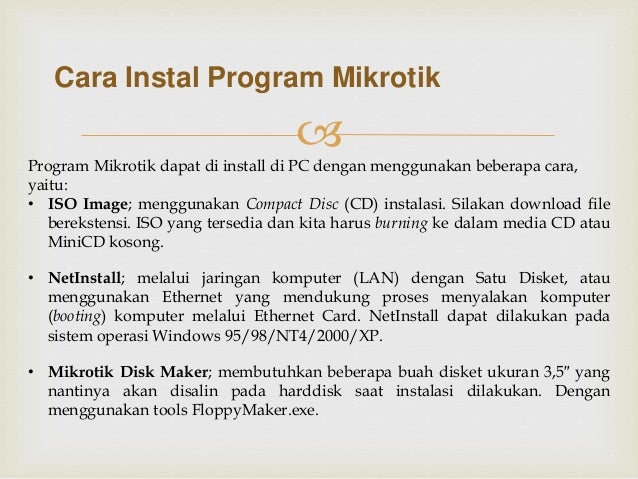 Instalasi Mikrotik Setelah pada tahap persiapan dengan memahai konsep dan