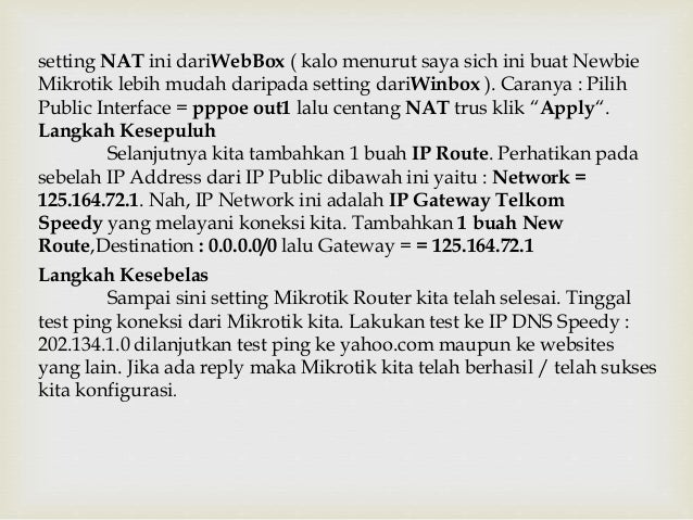 Masquarade. Selain setting dari Console atau dari Winbox, kita juga bisa