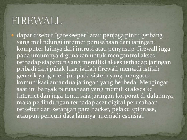 - 10. dapat disebut “gatekeeper” atau penjaga pintu gerbang yang melindungi internet perusahaan dari jaringan komputer laiinya dari intrusi atau penyusup, firewall juga pada umumnya digunakan untuk mengontrol akses terhadap siapapun yang memiliki akses terhadap jaringan pribadi dari pihak luar, istilah firewall menjadi istilah generik yang merujuk pada sistem yang mengatur komunikasi antar dua jaringan yang berbeda. Mengingat saat ini banyak perusahaan yang memiliki akses ke Internet dan juga tentu saja jaringan korporat di dalamnya, maka perlindungan terhadap aset digital perusahaan tersebut dari serangan para hacker, pelaku spionase, ataupun pencuri data lainnya, menjadi esensial.